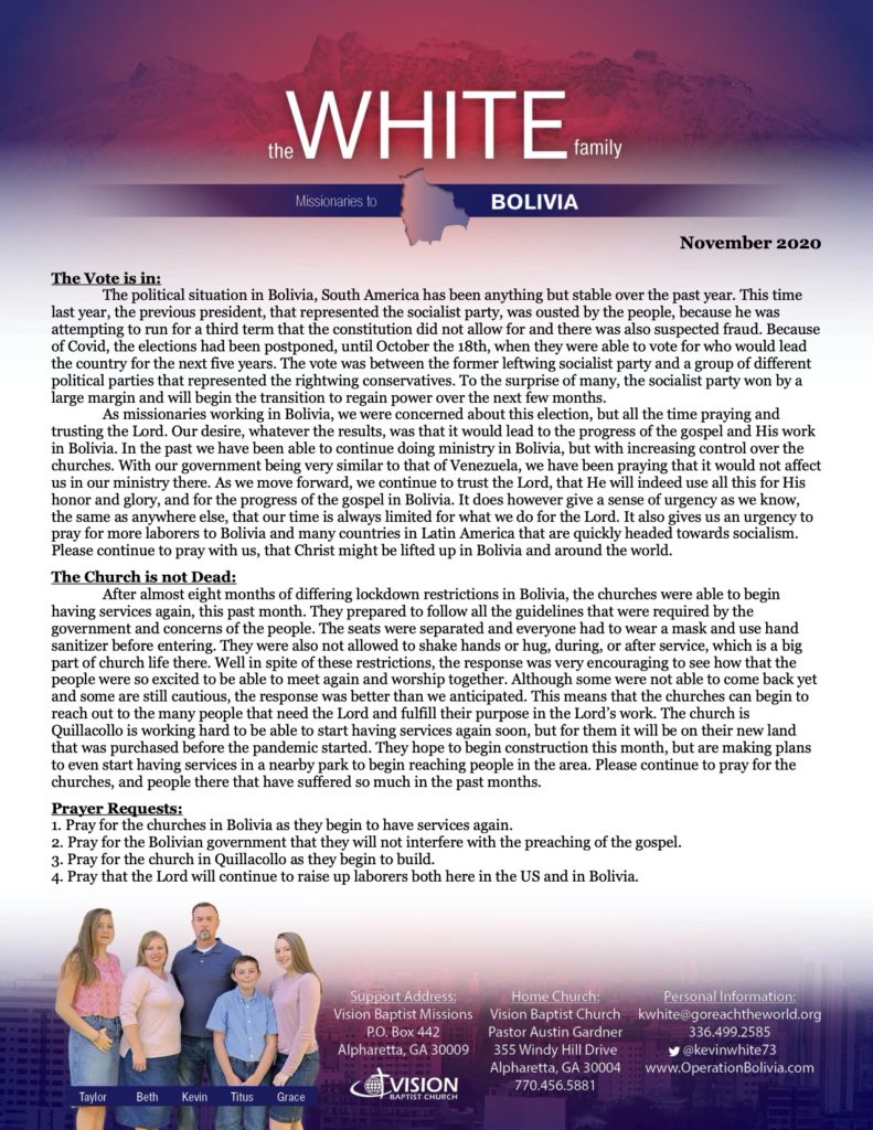 November Prayer Letter November 7, 2020 by Kevin White Download Prayer Letter: Download Prayer Letter Share this: Click to share on Facebook (Opens in new window) Facebook Click to share on X (Opens in new window) X
