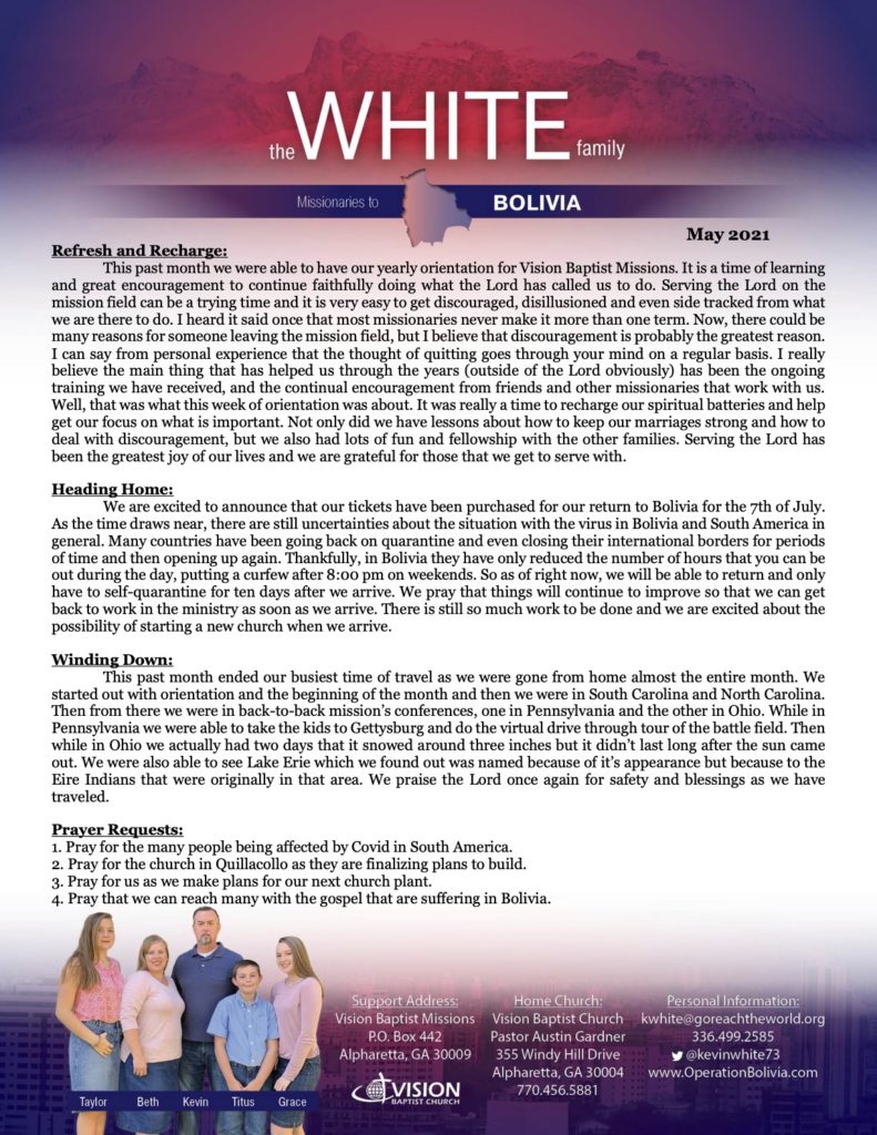 May Prayer Letter May 5, 2021 by Kevin White Download Prayer Letter Here: Download Prayer Letter Here: Share this: Click to share on Facebook (Opens in new window) Facebook Click to share on X (Opens in new window) X