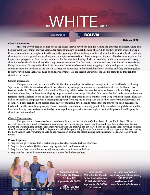 October Prayer Letter October 7, 2021 by Kevin White Download Prayer Letter Here: Download Here: Share this: Click to share on Facebook (Opens in new window) Facebook Click to share on X (Opens in new window) X