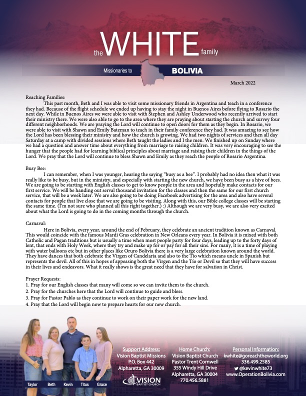 March Prayer Letter March 3, 2022 by Kevin White Download Prayer Letter Here: Download Here: Share this: Click to share on Facebook (Opens in new window) Facebook Click to share on X (Opens in new window) X