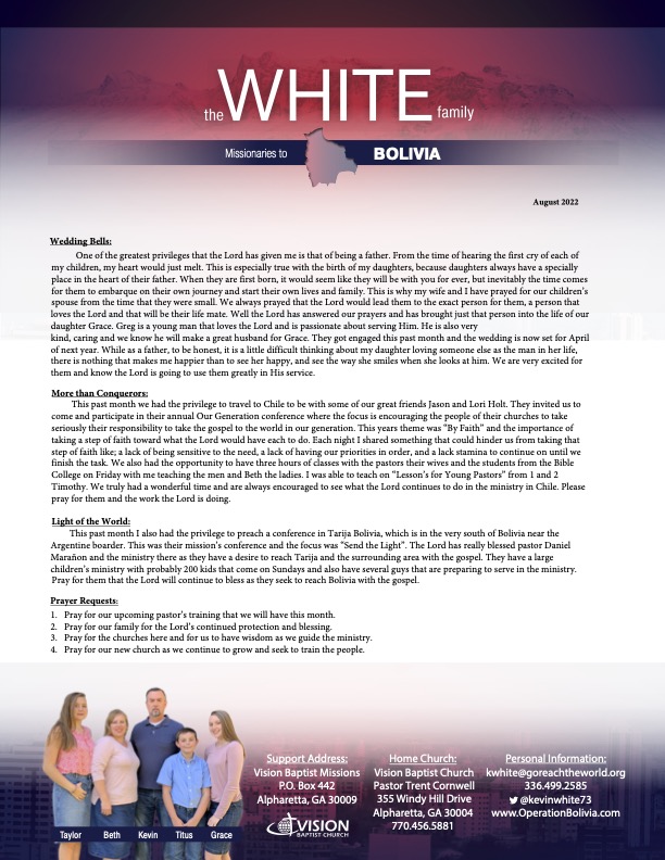August Prayer Letter August 9, 2022 by Kevin White Printable Version Here: Printable Version Here: Share this: Click to share on Facebook (Opens in new window) Facebook Click to share on X (Opens in new window) X