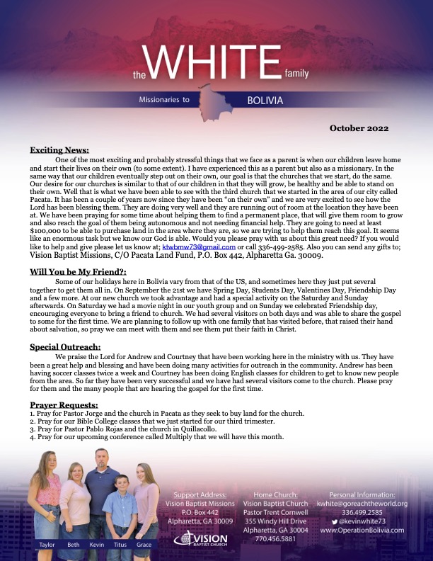 October Prayer Letter October 7, 2022 by Kevin White Download Printable Versión Here: Download Here: Share this: Click to share on Facebook (Opens in new window) Facebook Click to share on X (Opens in new window) X