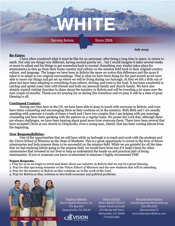 July 25 Prayer Letter July 9, 2025 by Kevin White Download Prayer Letter Here: Share this: Click to share on Facebook (Opens in new window) Facebook Click to share on X (Opens in new window) X