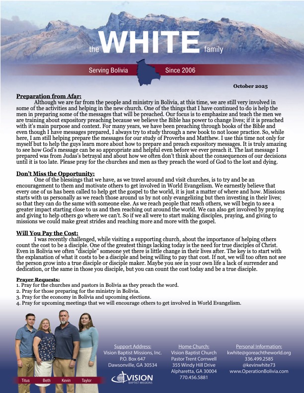 October 25 Prayer Letter October 9, 2025 by Kevin White Download Prayer Letter Here: Share this: Click to share on Facebook (Opens in new window) Facebook Click to share on X (Opens in new window) X